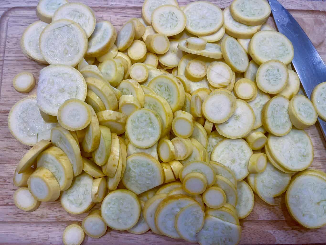 - Trim and thinly slice squash into rounds of equal thickness. This looks like a pile of squash, and it is. Squash contains a lot of water and it will cook down significantly.