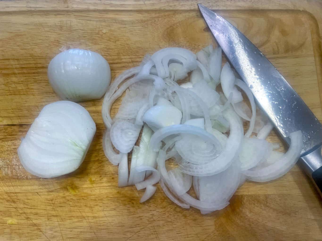 - Cut onions in half and thinly slice into rounds.