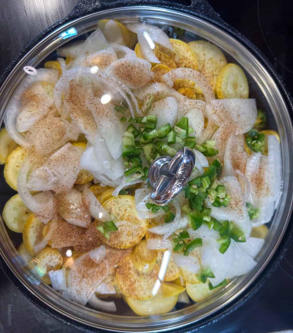 - Cover and place over medium heat. No need to add water. Squash contains a good amount of water. You want the vegetables to stew in their own juices. Cook for about 10 minutes or until squash is tender.