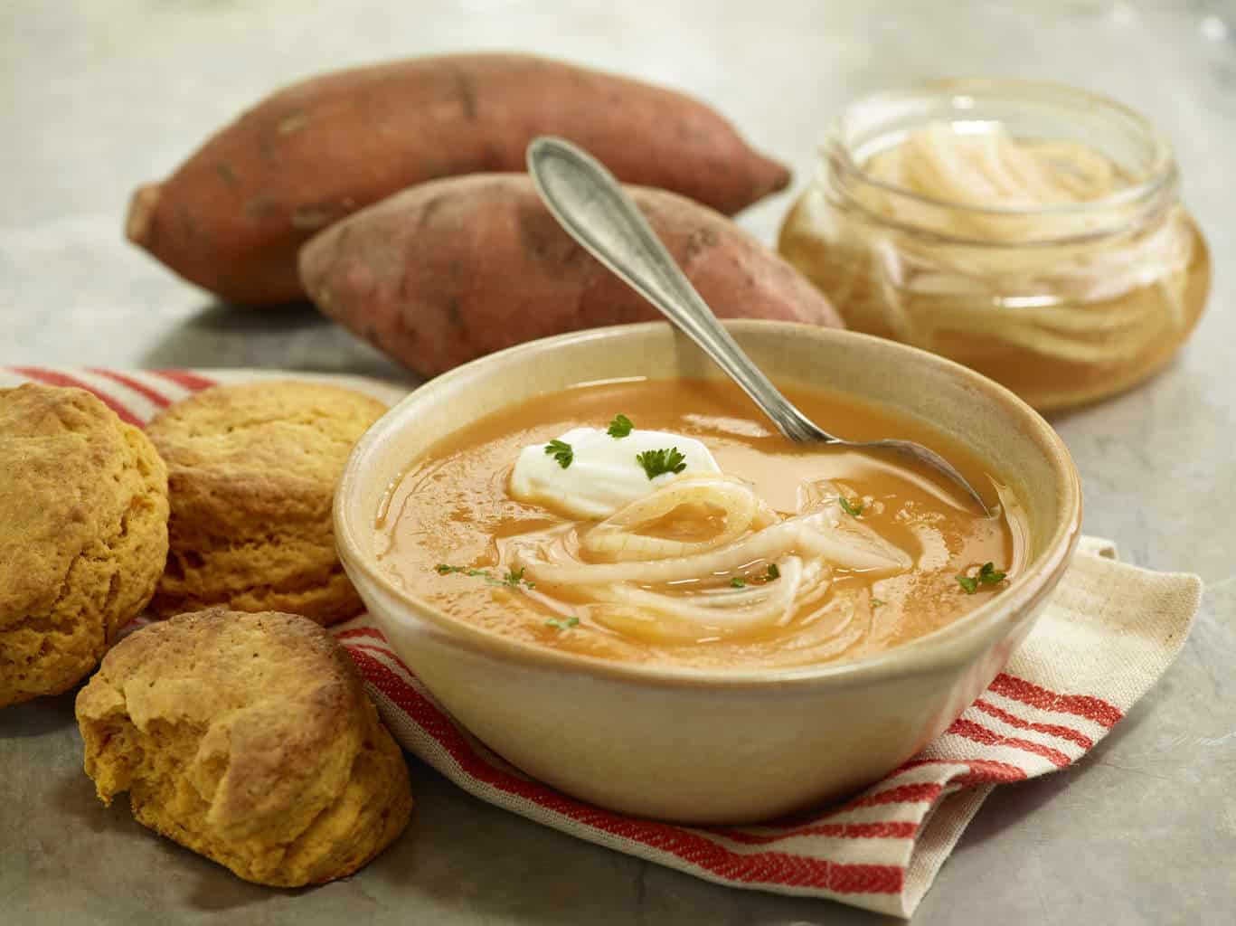 Sweet Potato Soup with Marinated Sweet Onions. Image: courtesy of Bland Farms Credit: Super Marketing Promotions