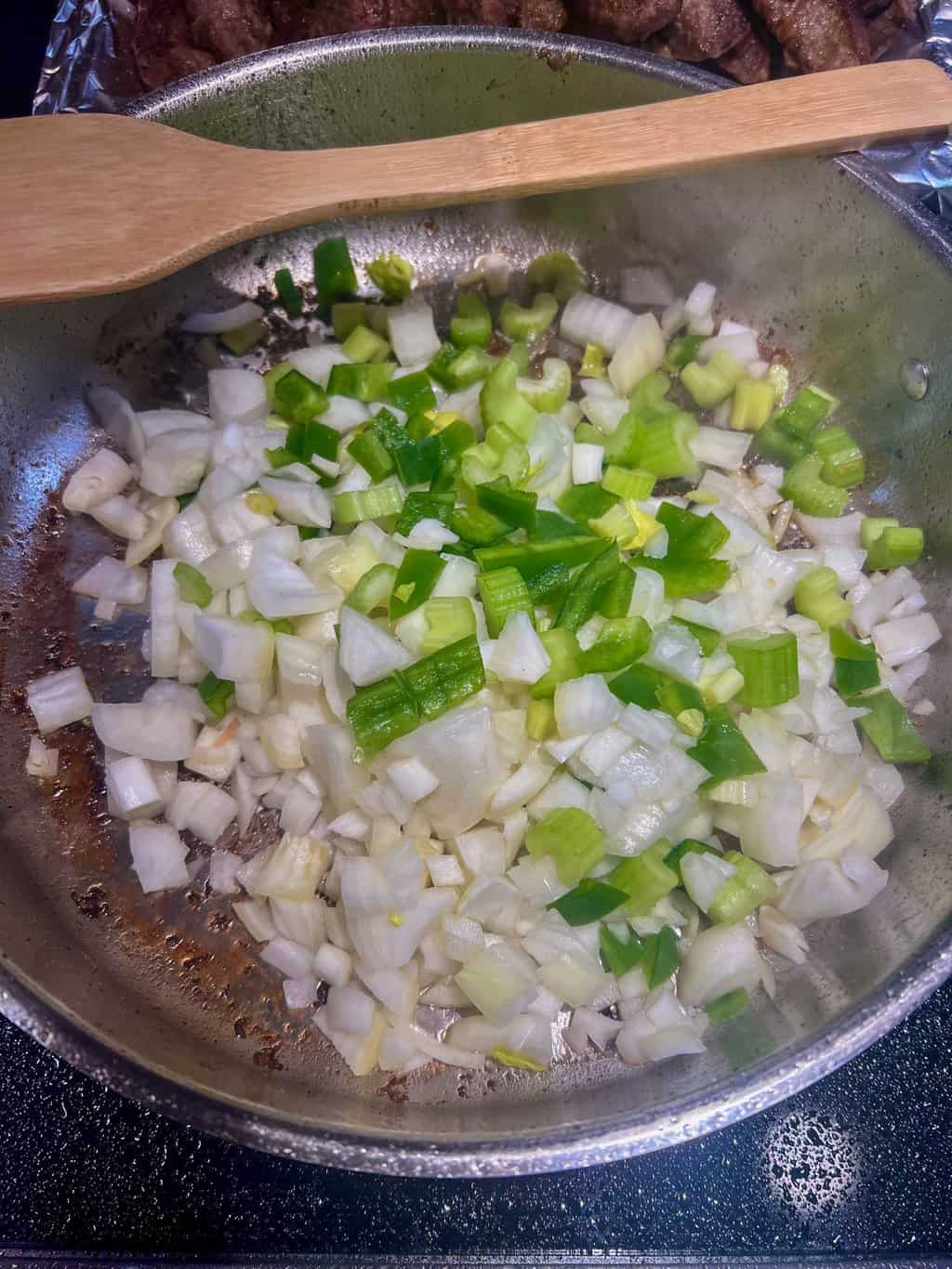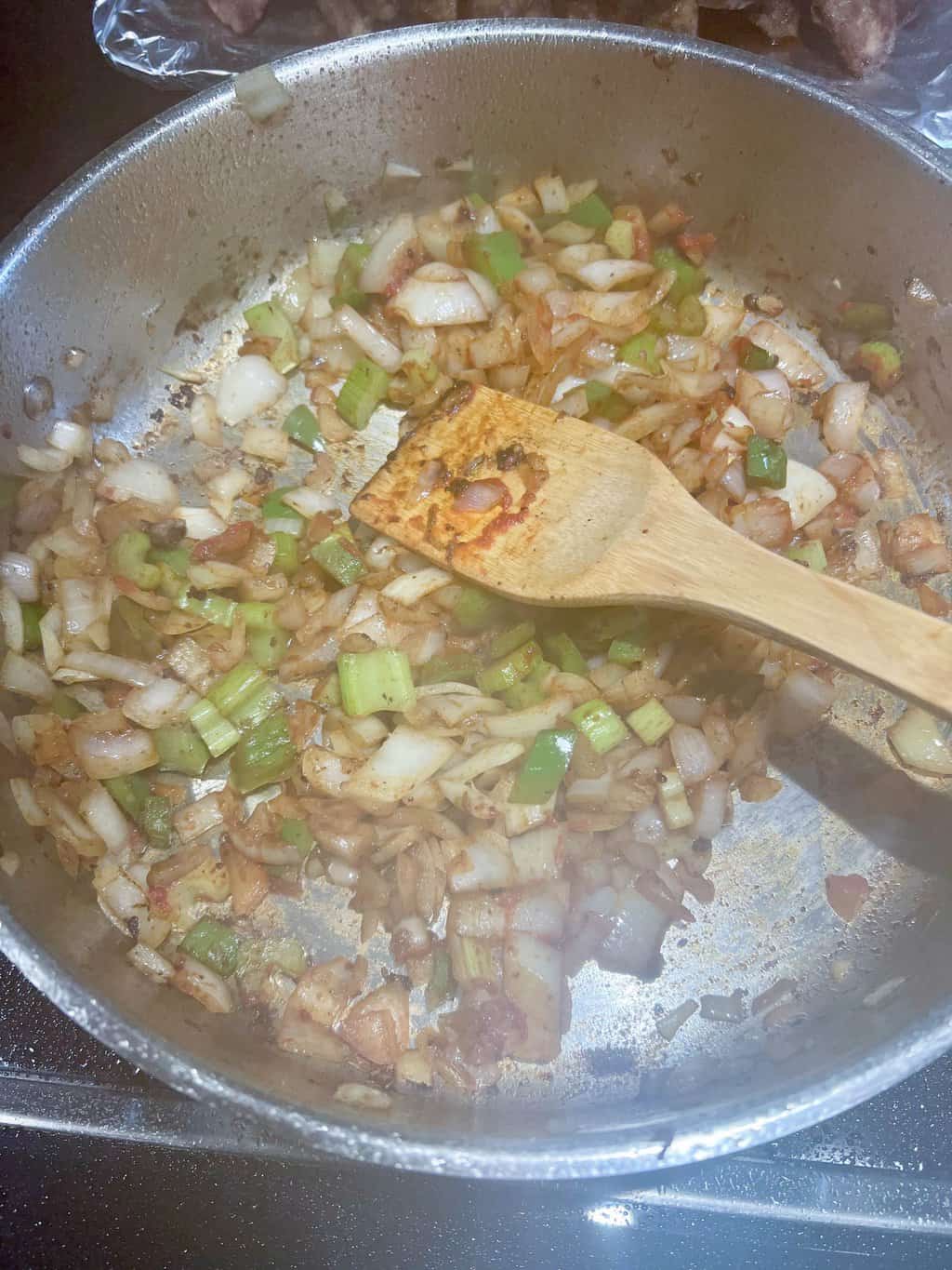 - To the same skillet, add onion, celery, and bell pepper. Add more oil if necessary. Cook the vegetables until tender, about 5 minutes. Stir frequently while cooking. Add garlic cloves and cook an additional 2 minutes.