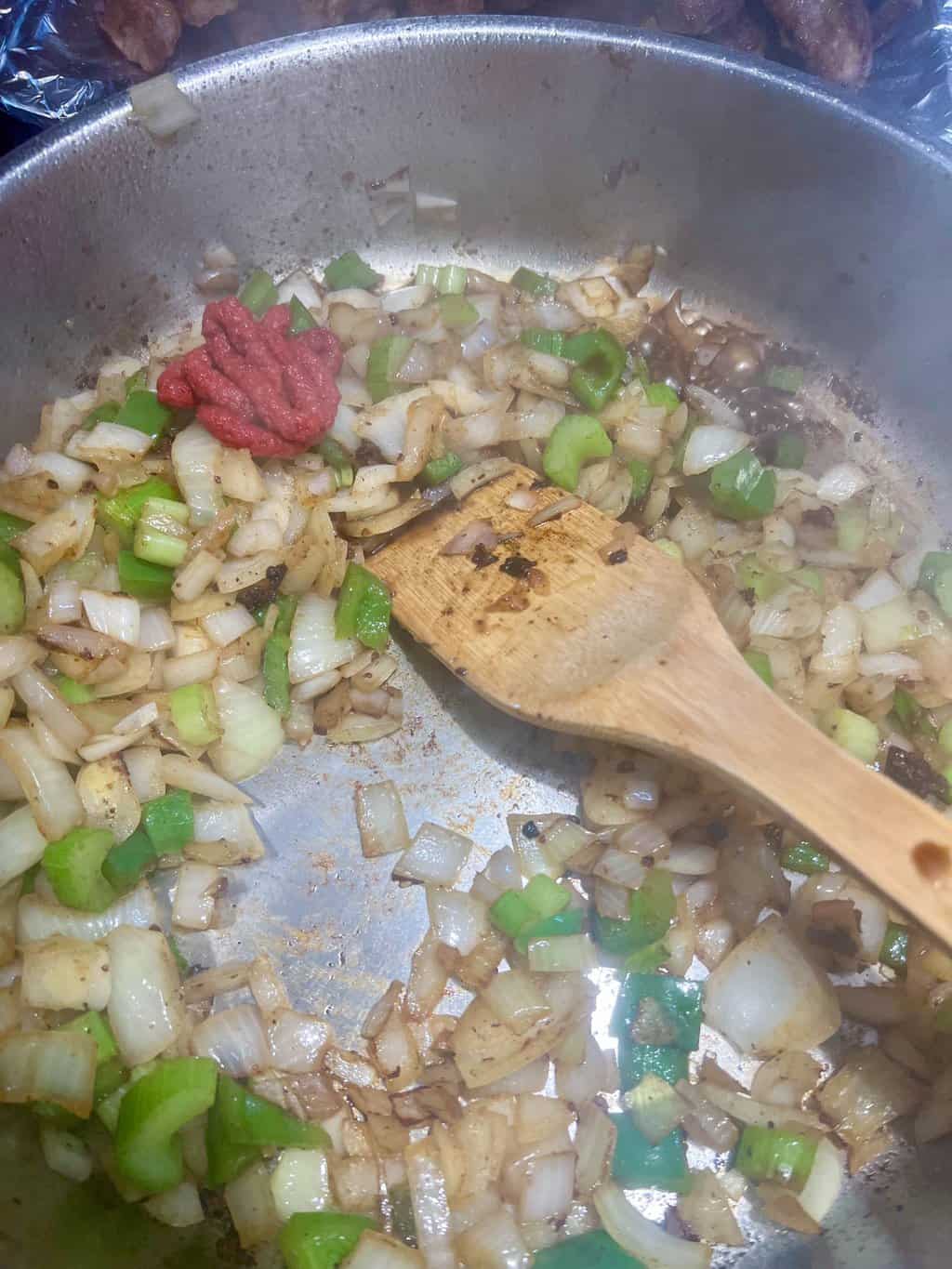 - Add tomato paste and stir into the vegetables.