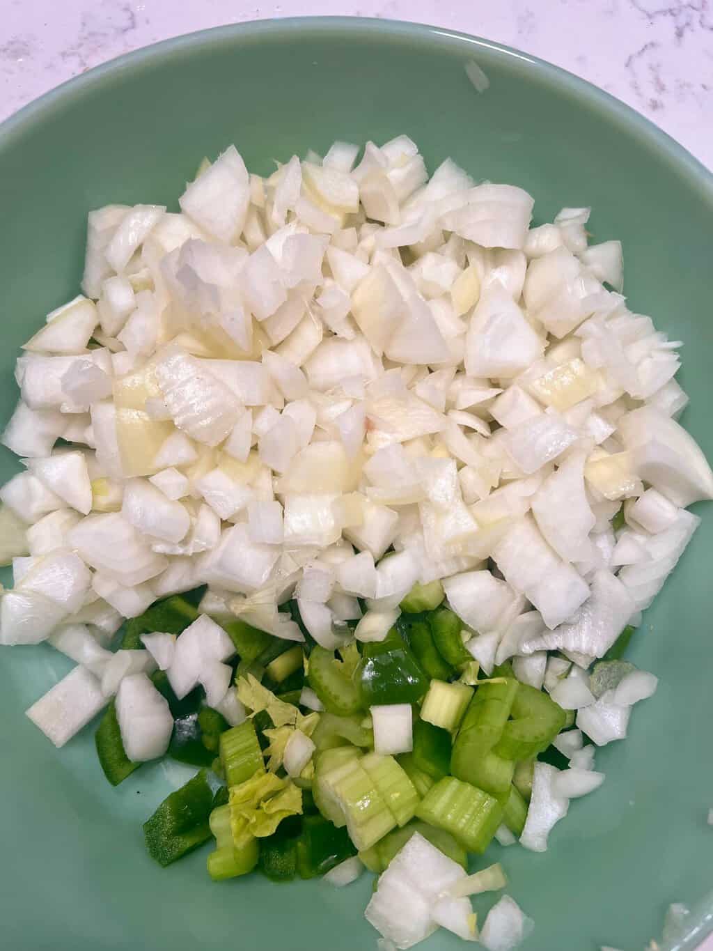 - Gather chopped onions, celery, and bell pepper.