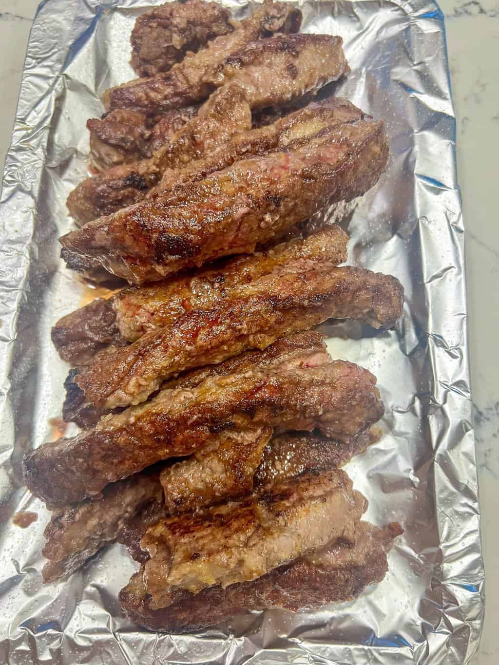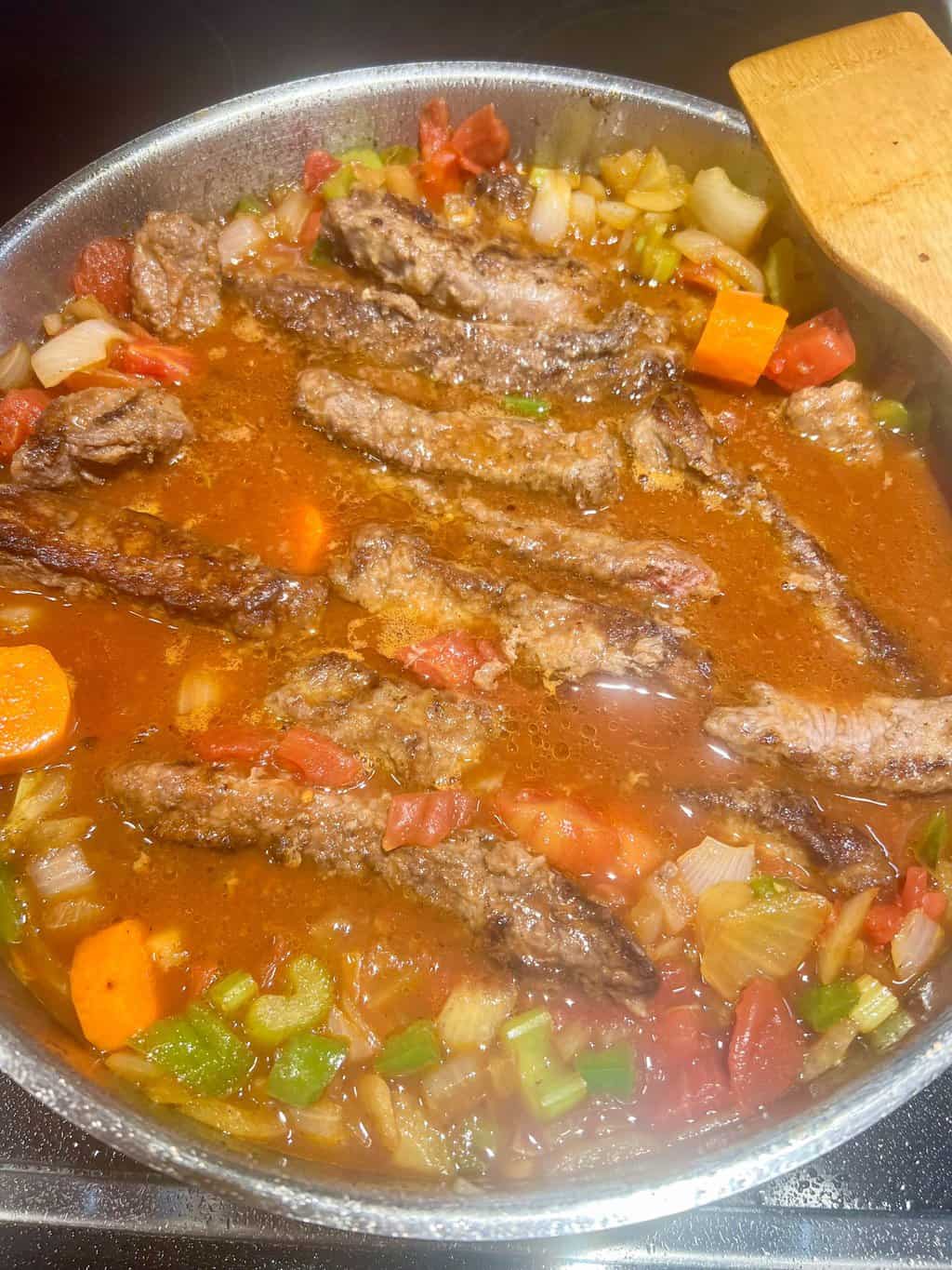 - Add browned steak strips and nestle them in the braising liquid.