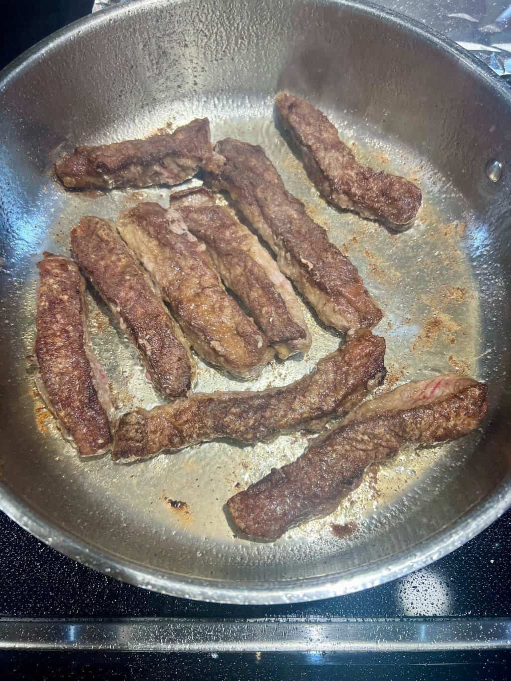 - Add floured steak strips to hot skillet in batches. Don't crowd. Cook each steak strip for 2 to 3 minutes on each side until browned.