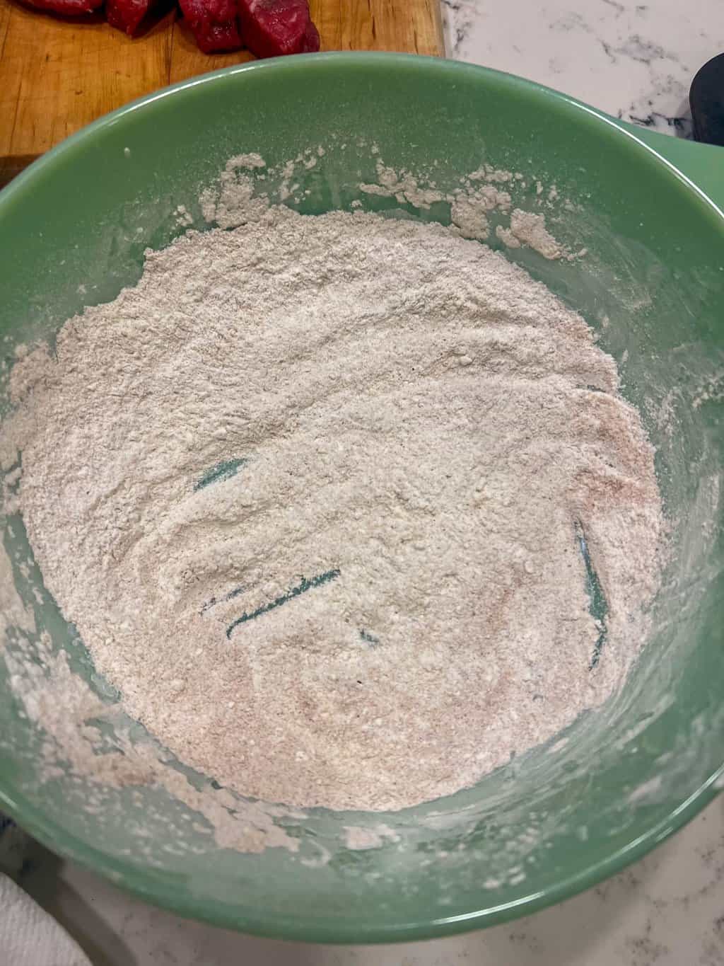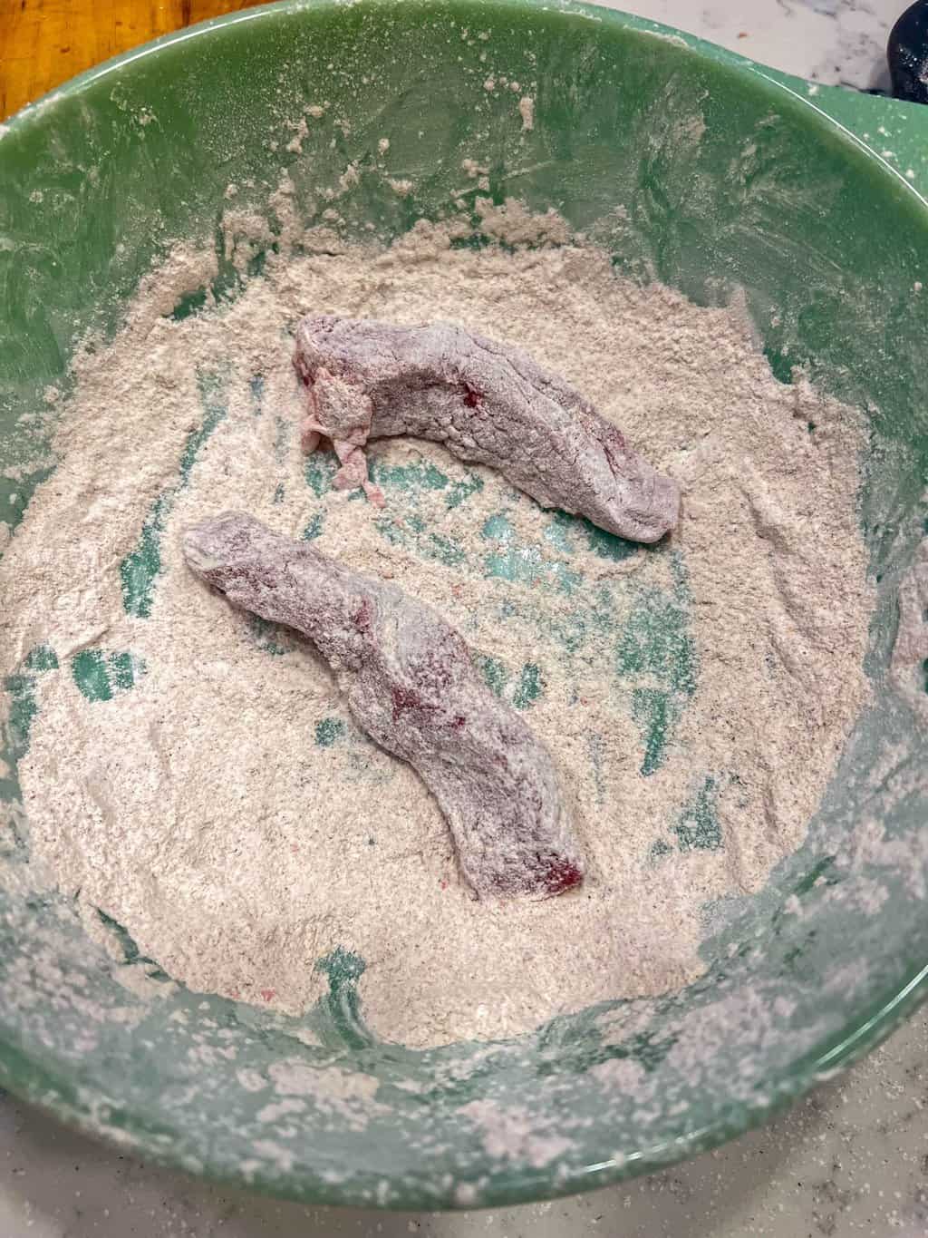 - Dredge the steak pieces in the flour. Shake off excess.