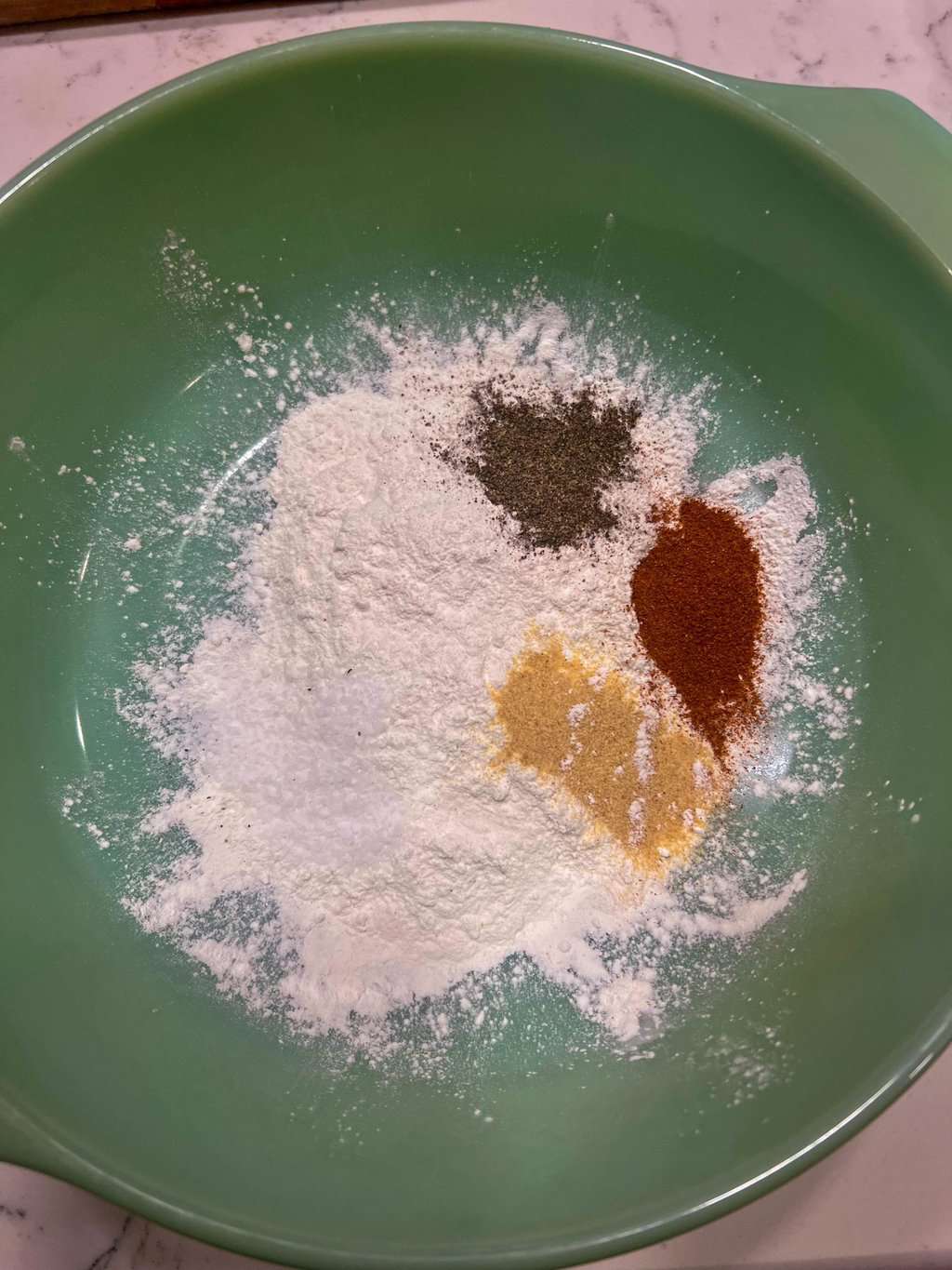 - Add flour, kosher salt, garlic powder, black pepper, and paprika to a bowl.
