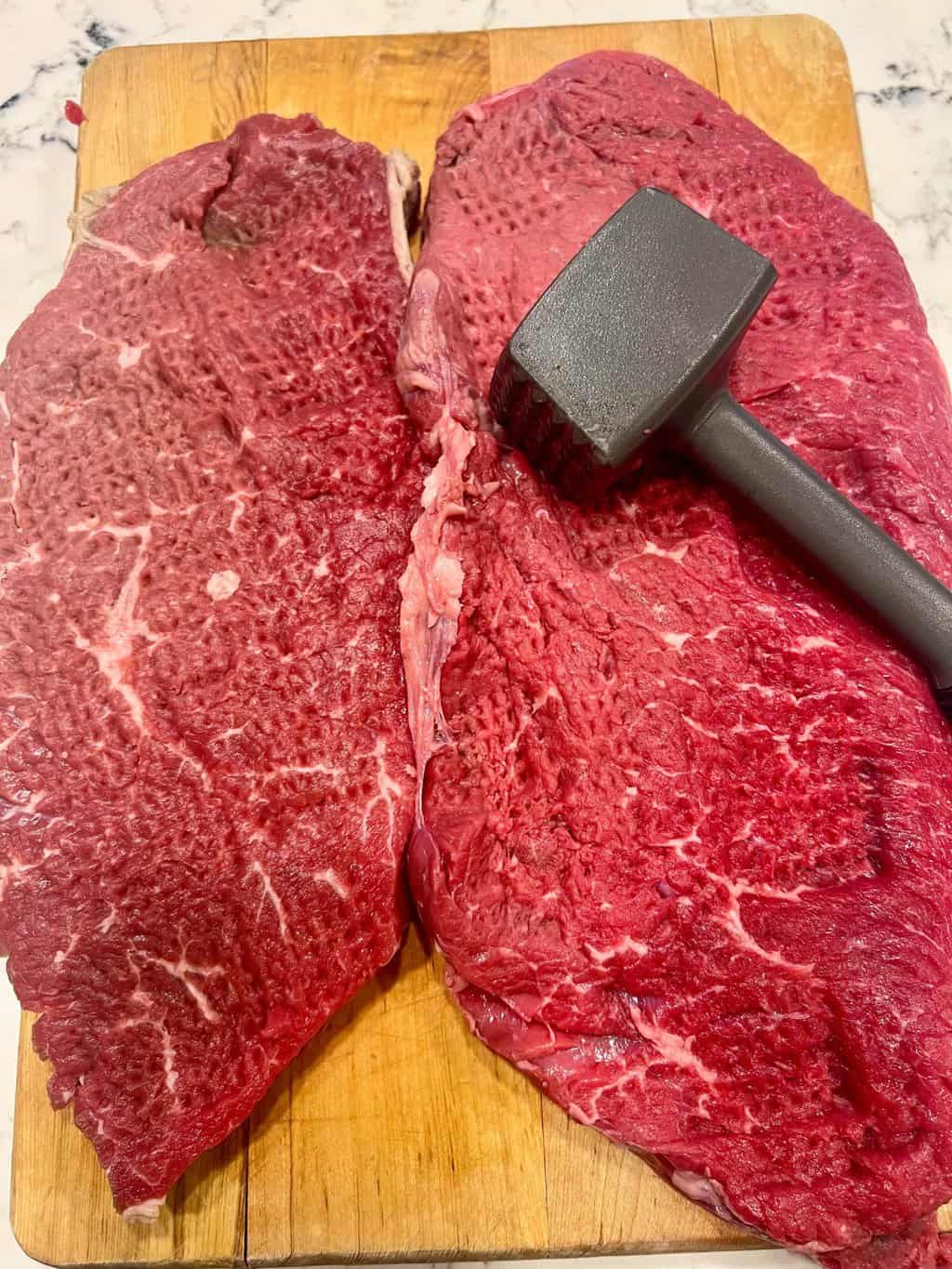 - Pound the steak to tenderize or swiss, to about 1/2 inch thick.