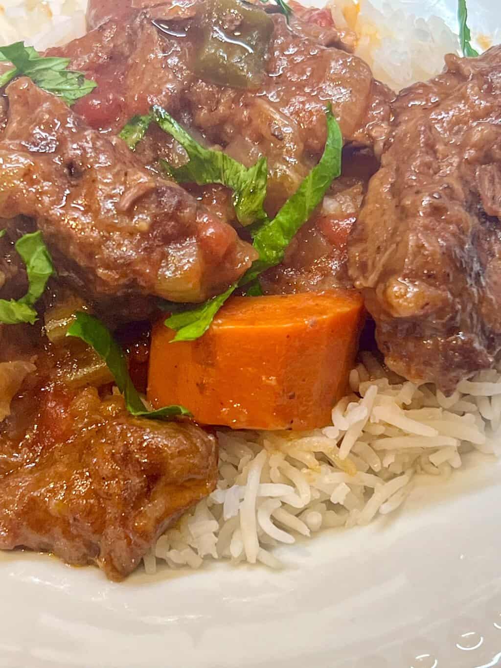 Swiss Steak is American classic comfort food composed of tenderized and browned round steak braised in a rich gravy containing tomatoes, carrots, and aromatics. Serve over rice.