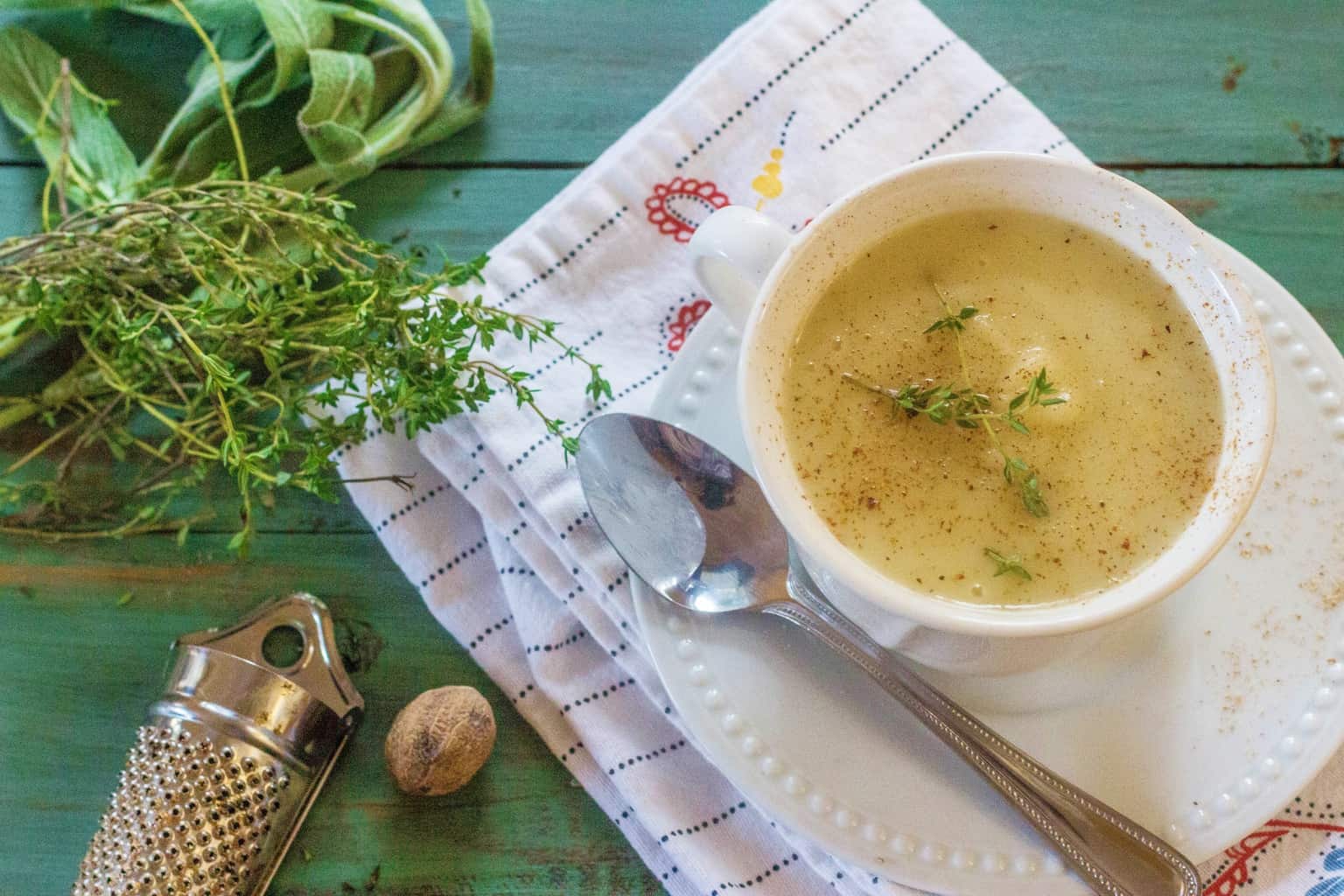 Creamy Turnip Potato Soup is turnip roots, Yukon Gold potatoes, sweet onions, garlic, and herbs stewed in butter with added chicken stock and served with a light grating of fresh nutmeg.